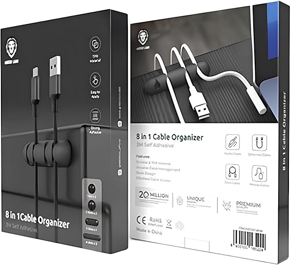 Green Lion - 8 in 1 Cable Organizer, TPR Material Durable, Easy To Apply, 3M Self Adhesive, Easy to Fit with Audio Cable, Ethernet Cable, Data Cable, Mouse Cable, Easy Cable Access - Black