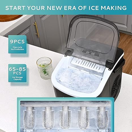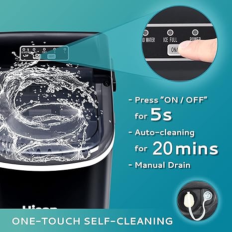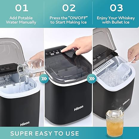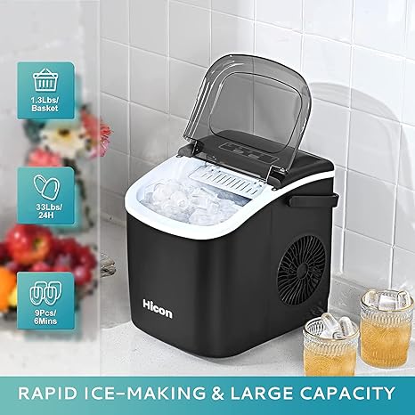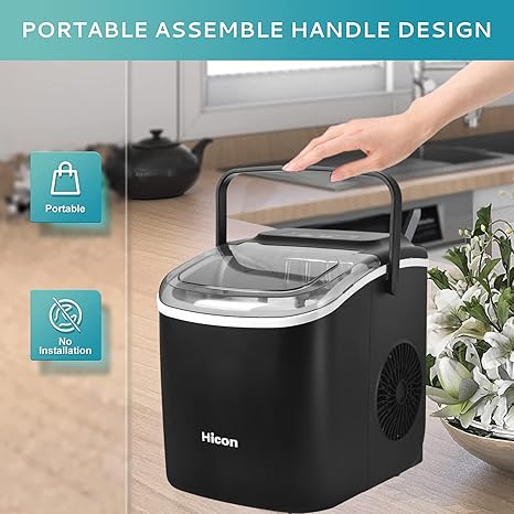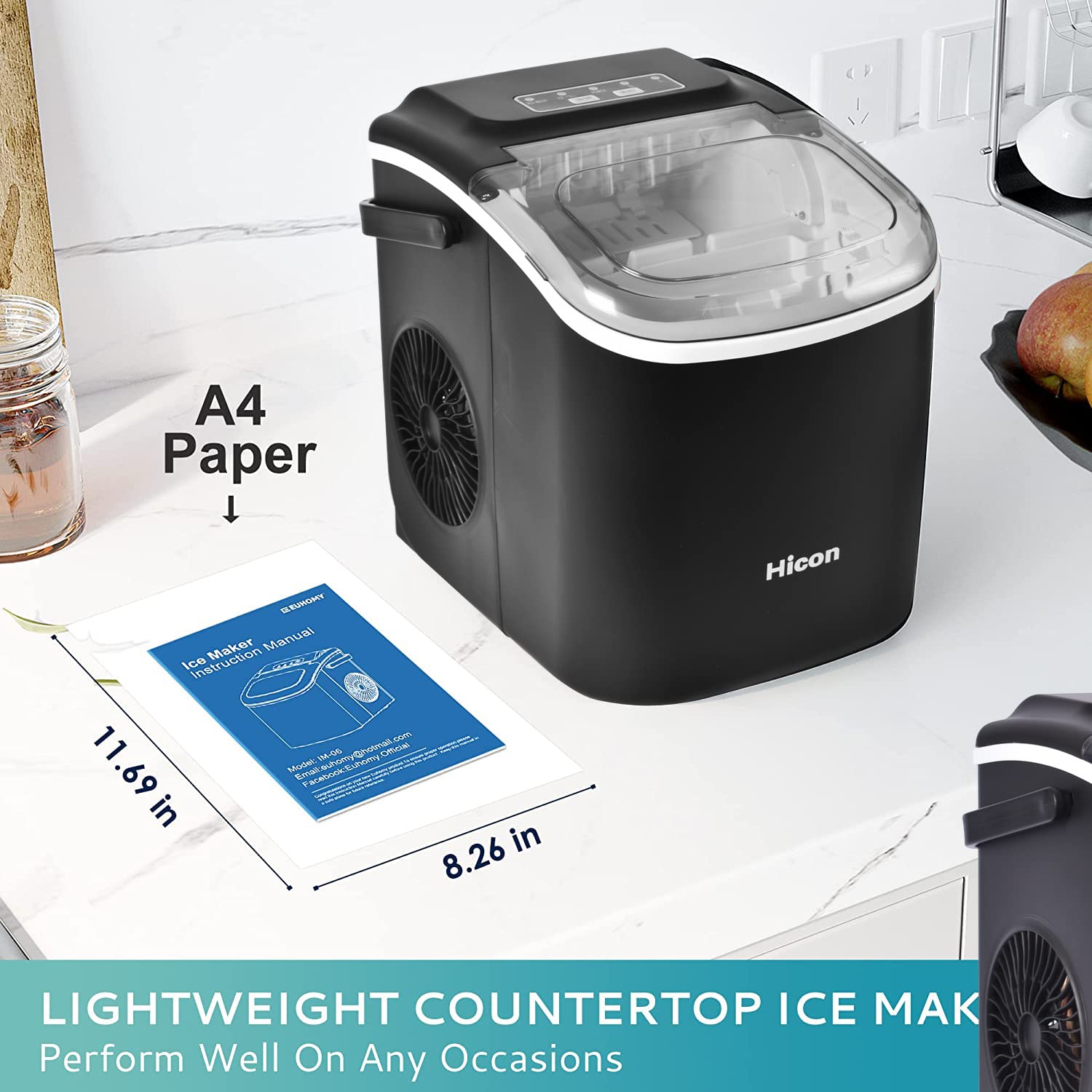 HICON Ice Cube Maker Machine Making Bullet Ice Cubes 33 lbs/24 hrs, With Handle and Automatic Cleaning Function, Countertop with Ice Scoop for Home Kitchen, Bars, Coffee Tea Shops (Plastic)