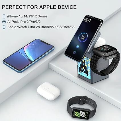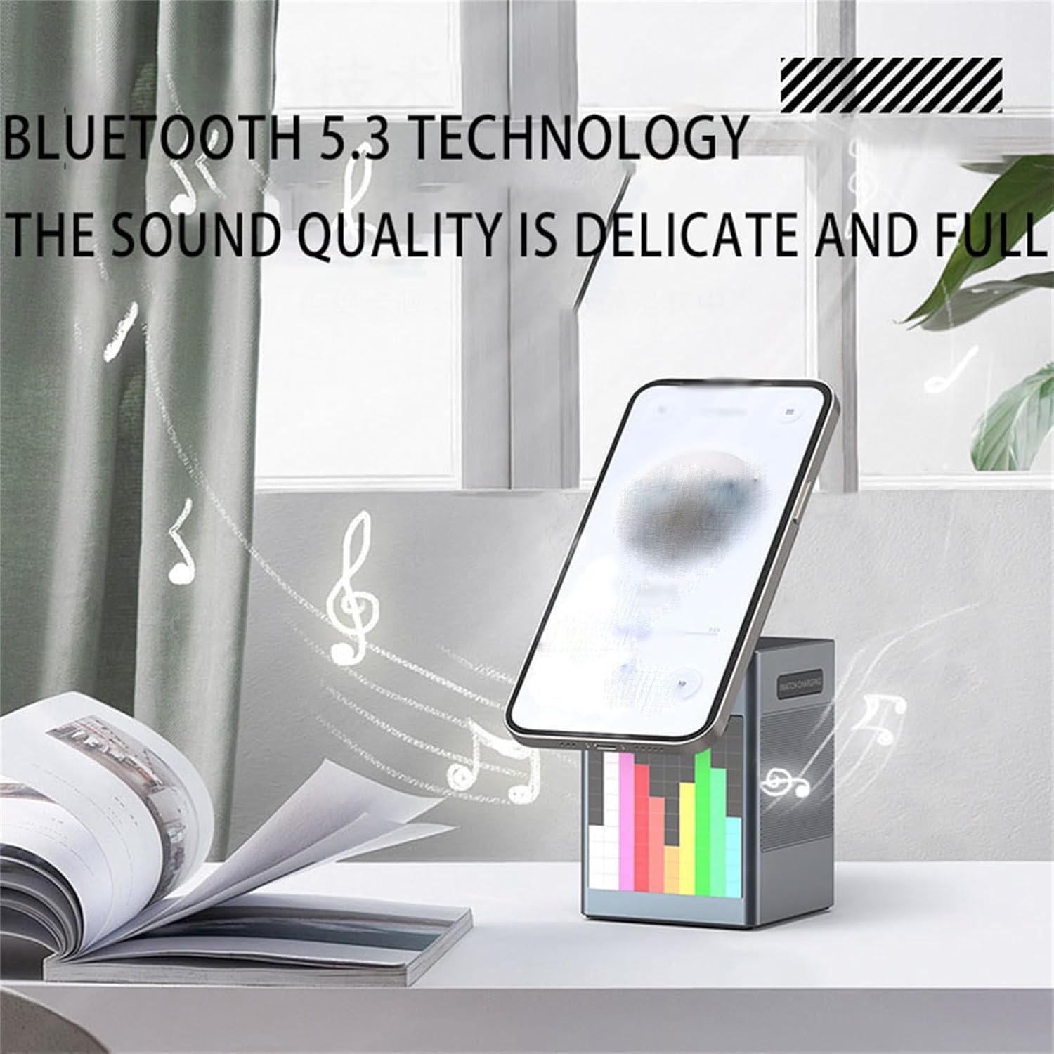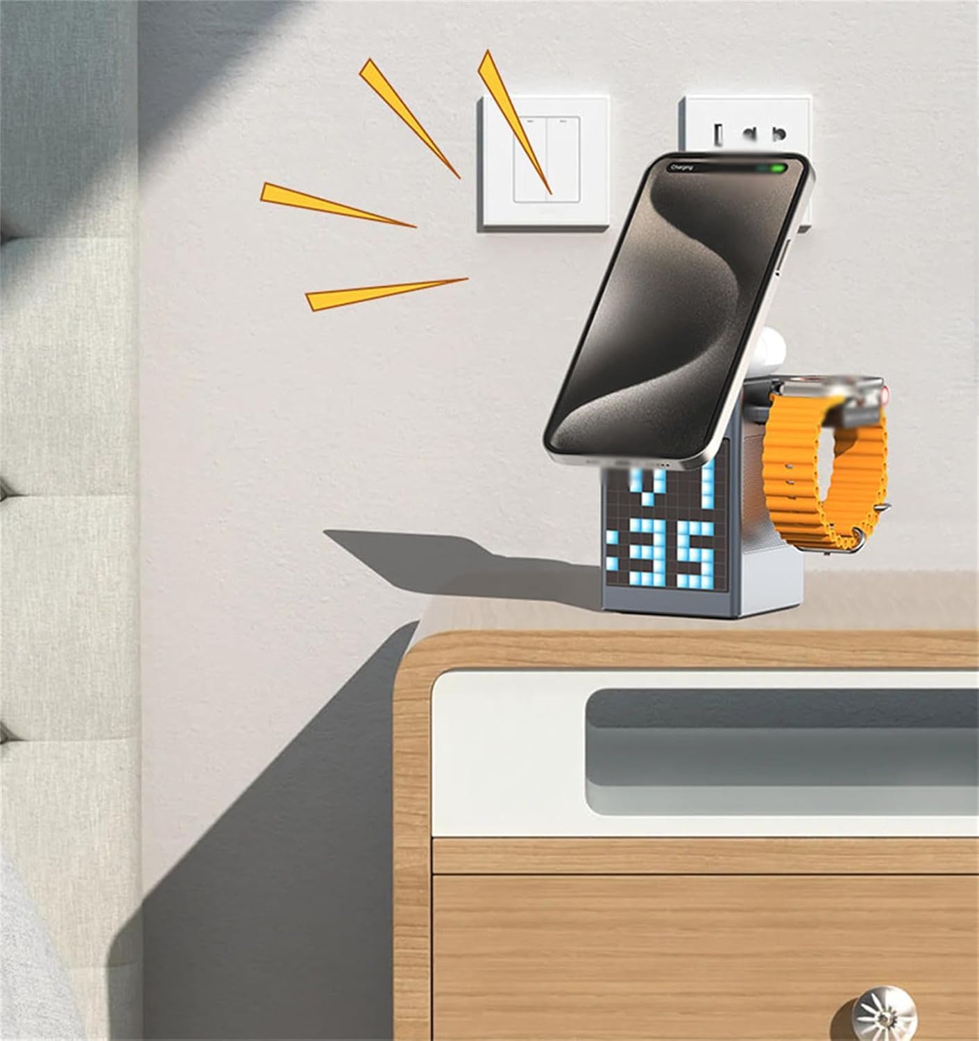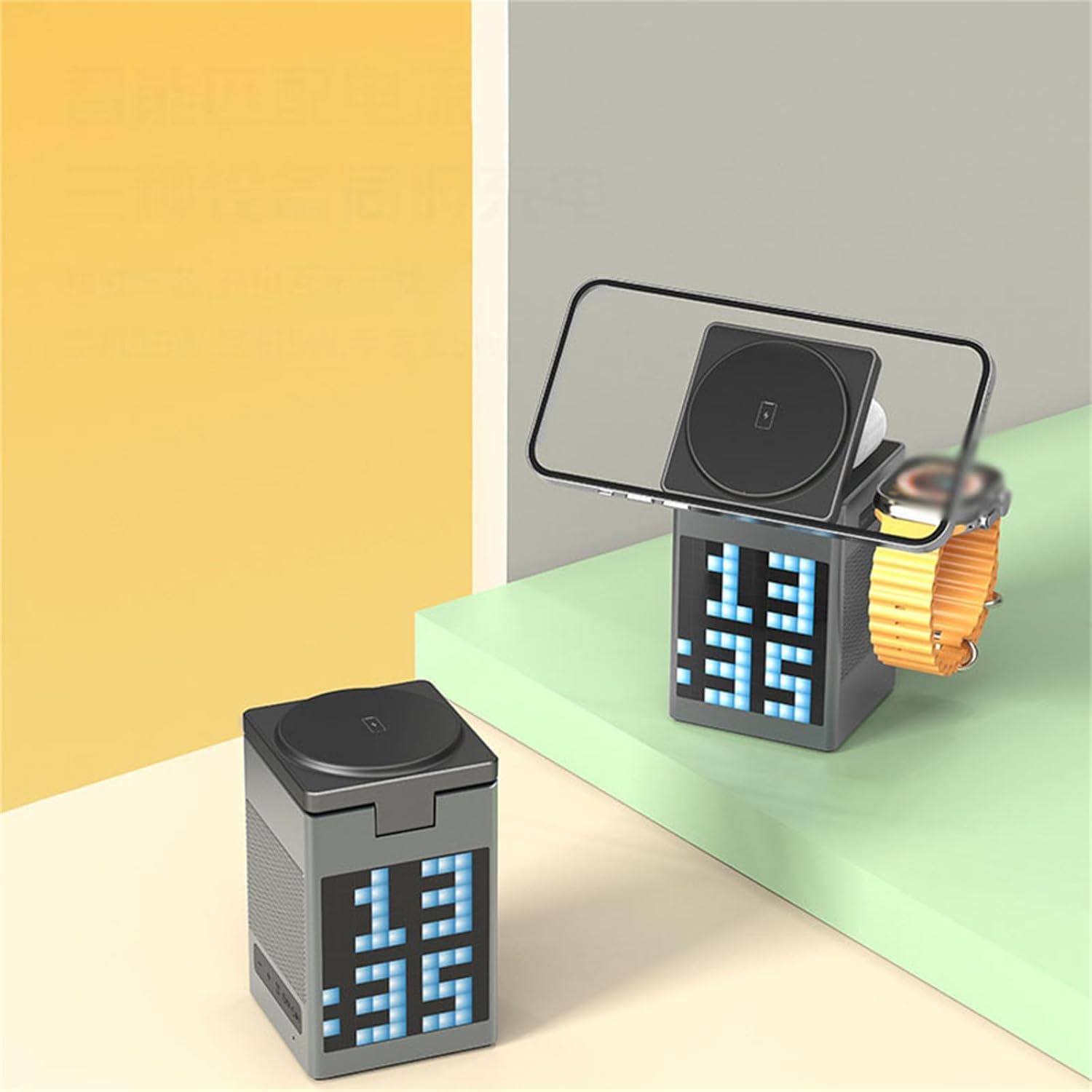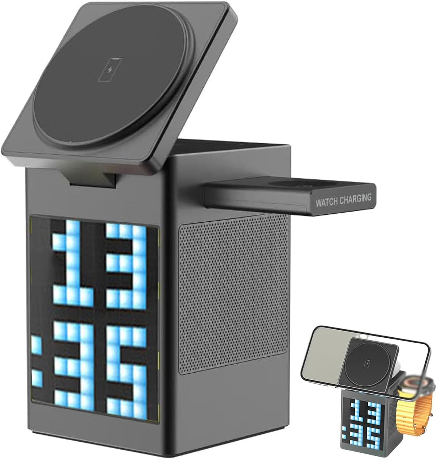 Pixelcharge 3-in-1 Bluetooth Speaker & Wireless Charger, Multifunctional Magnetic Wireless Charging Station with Alarm Clock Pixel Display, Ideal for Home, Bedroom, Office, Gifts